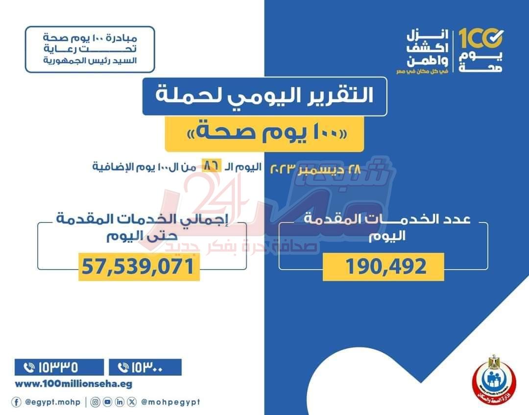 أعلن الدكتور خالد عبدالغفار وزير الصحة والسكان، تقديم 57 مليونا و539 ألفا و71 خدمة طبية من خلال حملة «100 يوم صحة» منذ انطلاقها يوم 25 يونيو الماضي، وحتى مساء أمس الخميس 28 ديسمبر، في جميع محافظات الجمهورية، وذلك بعد توجيهات فخامة الرئيس عبدالفتاح السيسي بمد عمل الحملة.