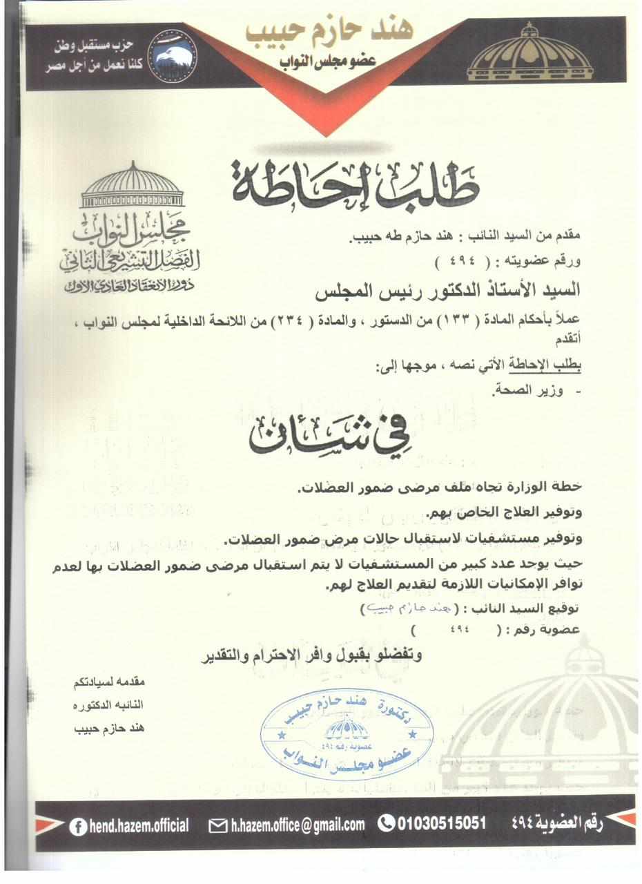 تقدمت النائبة هند حازم عضو لجنة التضامن الإجتماعي بمجلس النواب بطلب إحاطة إلى المستشار الدكتور حنفي جبالي، لتوجيه إلى وزير الصحة بشأن خطة الوزارة تجاه ملف مرضى ضمور العضلات وتوفير العلاج الخاص بهم.