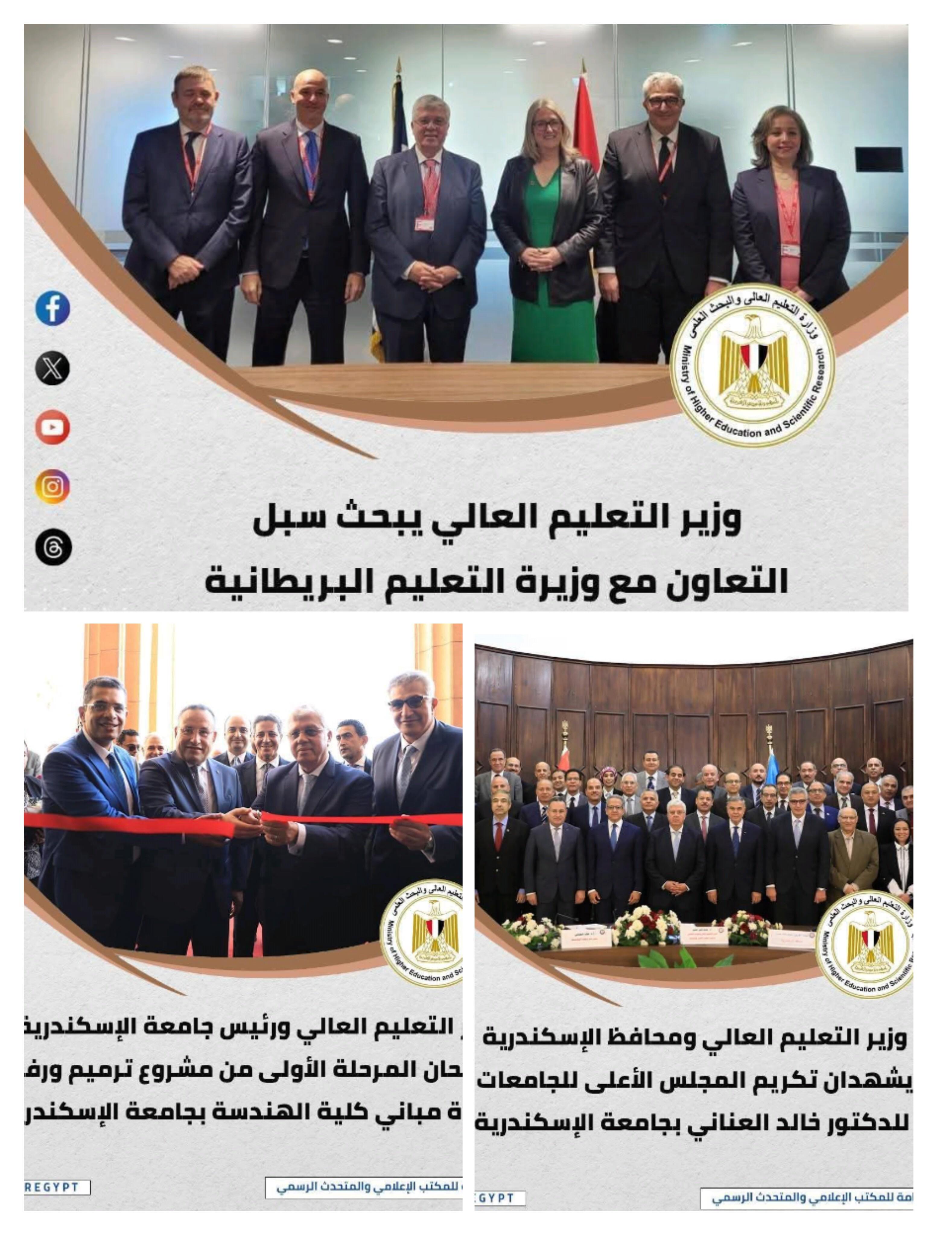 شهد الأسبوع الماضي نشاطًا مكثفًا لوزارة التعليم العالي والبحث العلمي، برئاسة الدكتور أيمن عاشور، حيث تنوعت الفعاليات بين مؤتمرات دولية واجتماعات لمجالس وهيئات تابعة للوزارة، ولقاءات تعاون ثنائي، في إطار مواصلة الجهود لتطوير منظومة التعليم العالي والبحث العلمي، وتعزيز دور الجامعات المصرية كمحرك رئيسي للابتكار والتنمية المستدامة وفق رؤية مصر 2030.