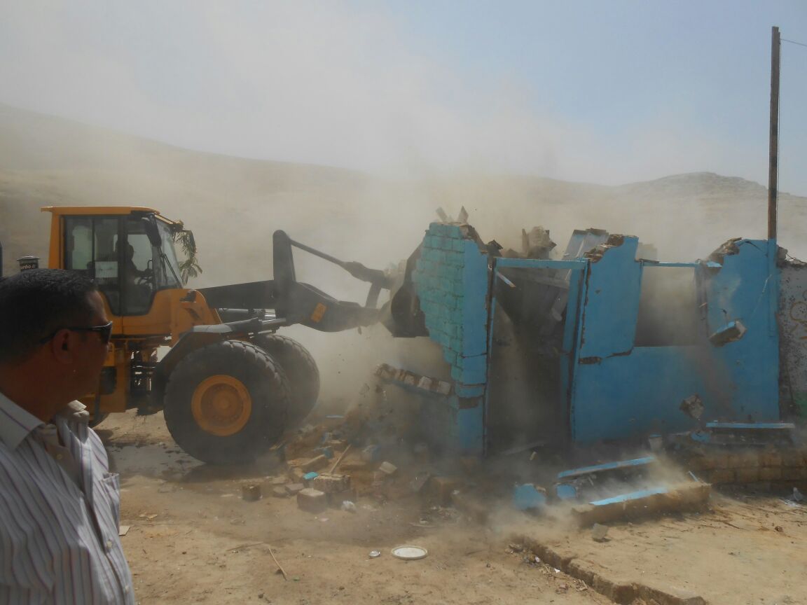 وقال المهندس محمد عبدالحميد القصرى: تم إزالة التعدى الواقع من أحد المواطنين على مساحة 25 فداناً تقع بالحد الشرقى للكردون يمين وصلة الجيش، داخل الموقع المخطط للإسكان الاجتماعى، والمتمثل فى زراعة شتلات موالح ومد خراطيم للرى، كما تمت إزالة التعدى الواقع على مساحة فدانين يسار الطريق الصحراوى الشرقى المنيا / القاهرة ك5، بجانب إزالة التعدى الواقع على مساحة 2495.5م2 داخل منطقة الحماية، والمتمثل فى إقامة سور من البلوك حول المنطقة بعرض 7م، وله بوابة حديد وبداخل السور بعض المبانى، إضافة إلى إزالة التعدى الواقع على مساحة 175م2 يسار الطريق الصحراوى الشرقى المنيا / القاهرة ك4، والمتمثل فى إقامة مبان من البلوك بارتفاع 3م.
