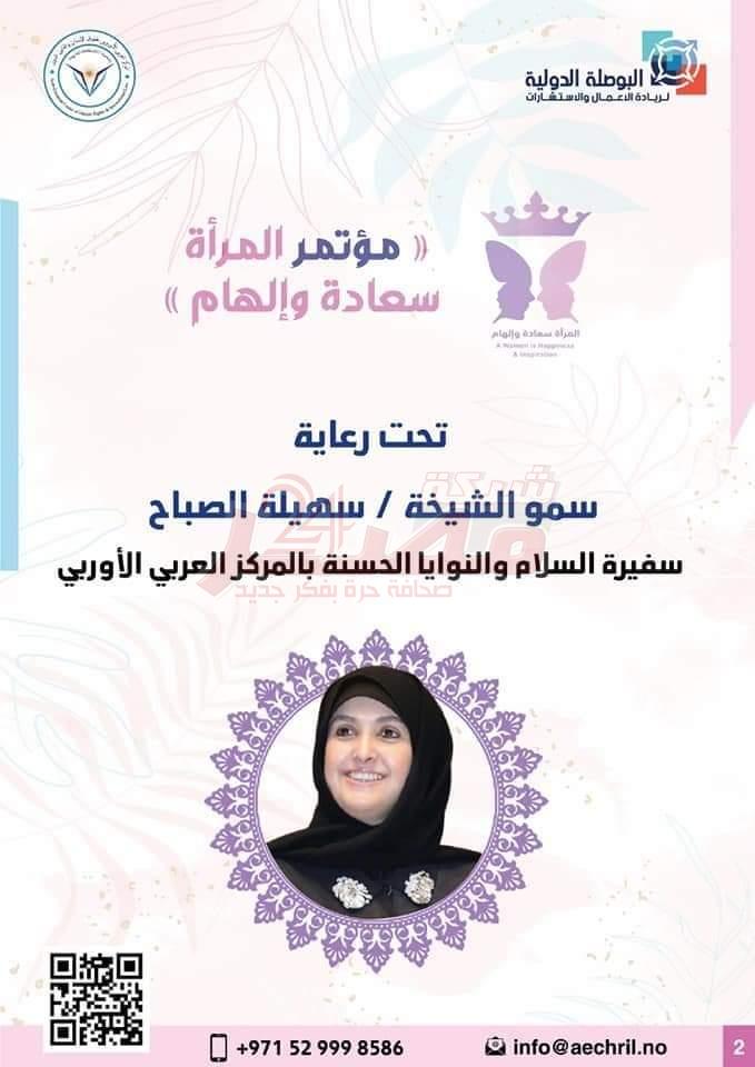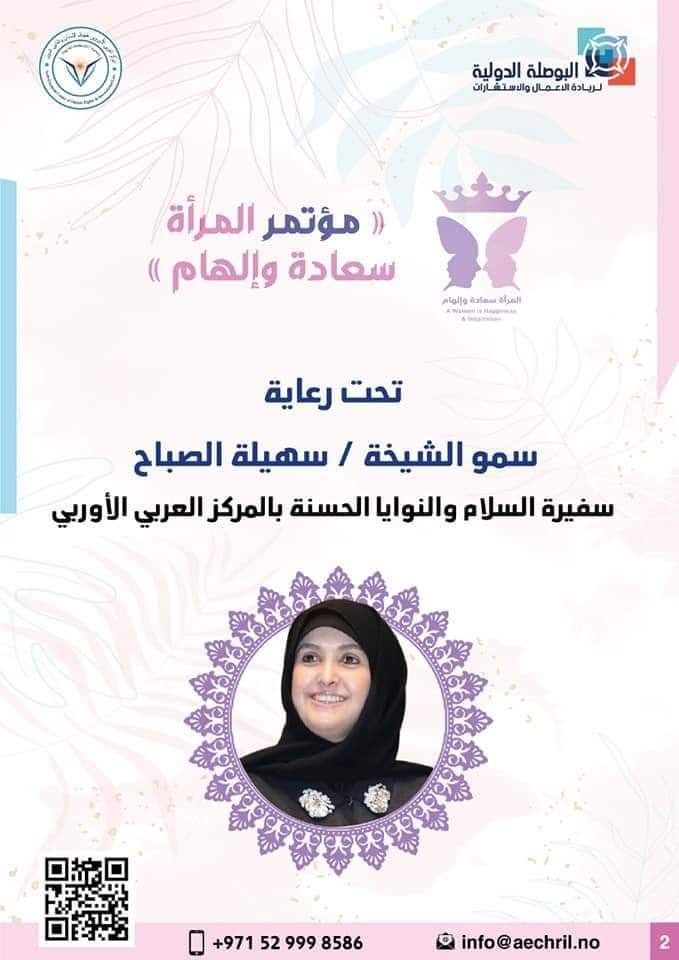 تنطلق فعاليات مؤتمر المرأة سعادة والهام .. أواخر مارس تحت رعاية سمو الشيخة سهيلة الصباح سفيرة السلام والنوايا الحسنة في المركز العربي الاوروبي لحقوق الانسان والقانون الدولي والراعي الفخري الشيخ الدكتور عبد الله السيهاتي الرئيس الفخري في المركز العربي الأوروبي وعضو الأمانة العامة .