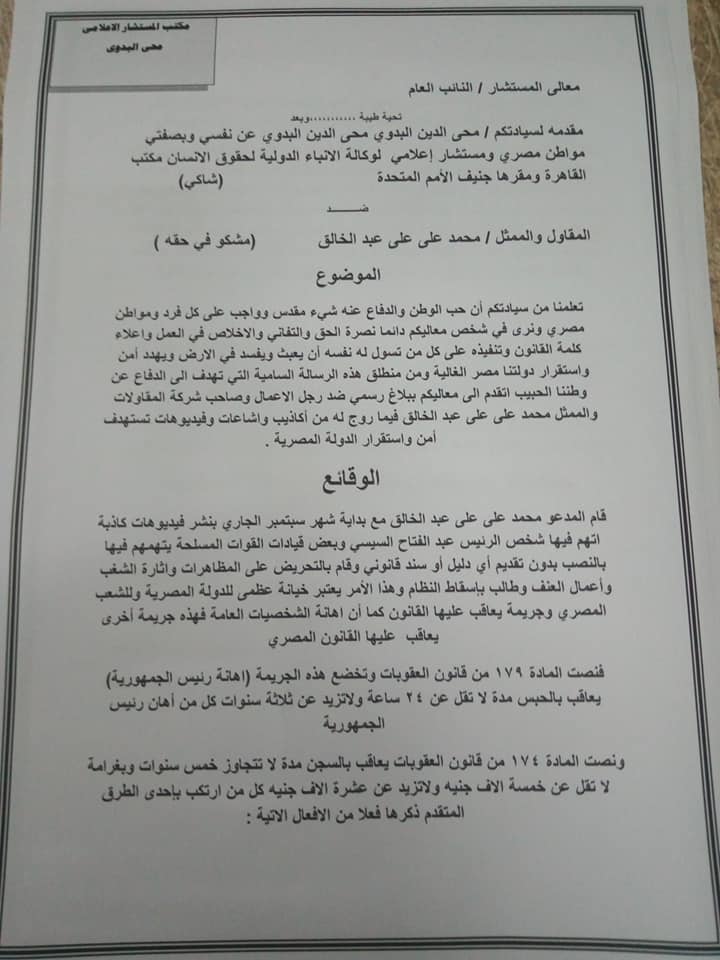 قام المستشار محي البدوي المستشار الإعلامي لوكالة الأنباء الدولية لحقوق الإنسان بجنيف بالأمم المتحدة والمسؤول الإعلامي للوكالة بمصر بتقديم بلاغ رسمي للنائب العام يتهم فيه المقاول والممثل محمد علي بتهمة التحريض ضد الدولة المصرية والدعوة لاثارة الشغب والفوضي وتوجيه الاتهامات الكاذبة التي تحمل إهانه لشخص الرئيس عبد الفتاح السيسي والقوات المسلحة والشعب المصري وأستند محي البدوي الي أن شخص الرئيس يمثل جموع المصريين في كل مكان وانه جاء بانتخابات الشعب المصري وأن توجيه أي إهانه له تمثل إهانه للشعب المصري أجمع كذلك الأمر بالنسبة للقوات المسلحة بإعتبارها السيف والدرع الذي يحمي الشعب المصري وكرامته من كرامة الشعب نفسه.