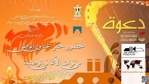 يتشرف المركز القومي للمسرح والموسيقى والفنون الشعبية تحت رعاية وزارة الثقافة وقطاع شئون الإنتاج الثقافي وبالتعاون مع مركز الهناجر للفنون أن يدعوكم على الحفل الموسيقي الذي تحييه فرقة المركز القومي للمسرح والموسيقى بمناسبة الذكرى 64 لثورة 23 يوليو 52 بعنوان (غناوي عاشت للوطن) تتضمن مجموعة منتقاة من تراث الأغاني الوطنية وأغاني المقاومة من أرشيف إدارة التراث والتوثيق الموسيقي .