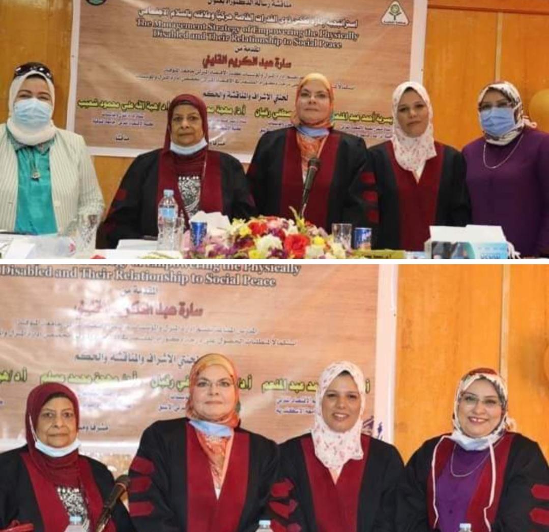 حصلت الباحثة سارة عبد الكريم القلينى بكلية الإقتصاد المنزلي جامعة المنوفية على درجة الدكتوراه والتي جاءت بعنوان (استراتيجية إدارة تمكين ذوى القدرات الخاصة حركيا وعلاقتة بالسلام الاجتماعى.