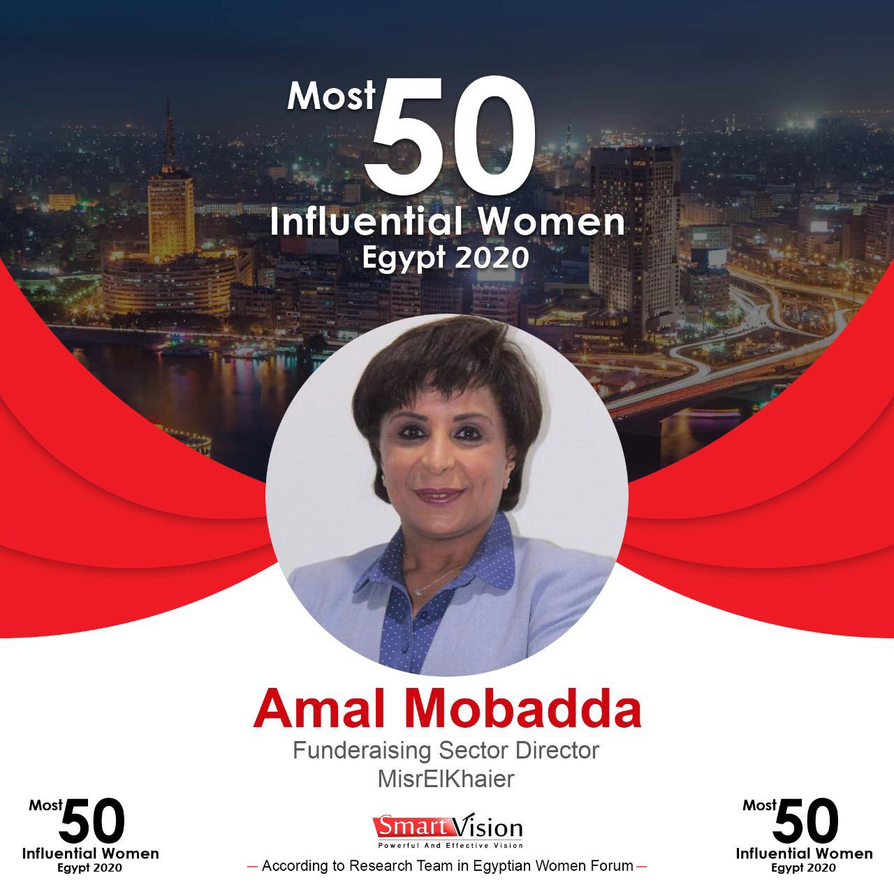 وتضم القائمة 50 سيدة مصرية مؤثرة في الحياة المصرية و المجتمع المصري وعالم المال والاعمال وذلك طبقا لقسم الابحاث بسمارت فيجن بالتعاون مع فريق منتدي المراة المصرية