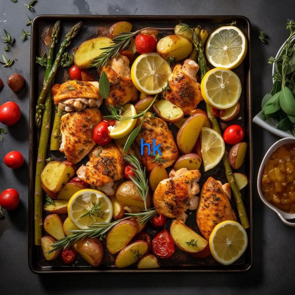بعد ٢٠ دقيقة من تحميص البطاطس، أخرج الصينية من الفرن وأضف الهليون حول البطاطس. ضع الدجاج فوق الخضار وأعدها إلى الفرن لمدة ٢٠-٢٥ دقيقة أخرى أو حتى ينضج الدجاج تمامًا.