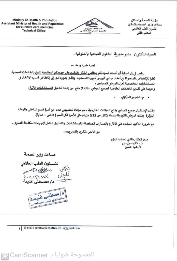 وأتي ذلك في إطار خطة الدولة لمواجهة الموجة الثالثة من فيروس كورونا المستجد كوفيد ١٩، وتنفيذاً لتوجيهات وتعليمات الدكتورة هالة زايد، وزيرة الصحة والسكان، واللواء إبراهيم أبو ليمون، محافظ المنوفية