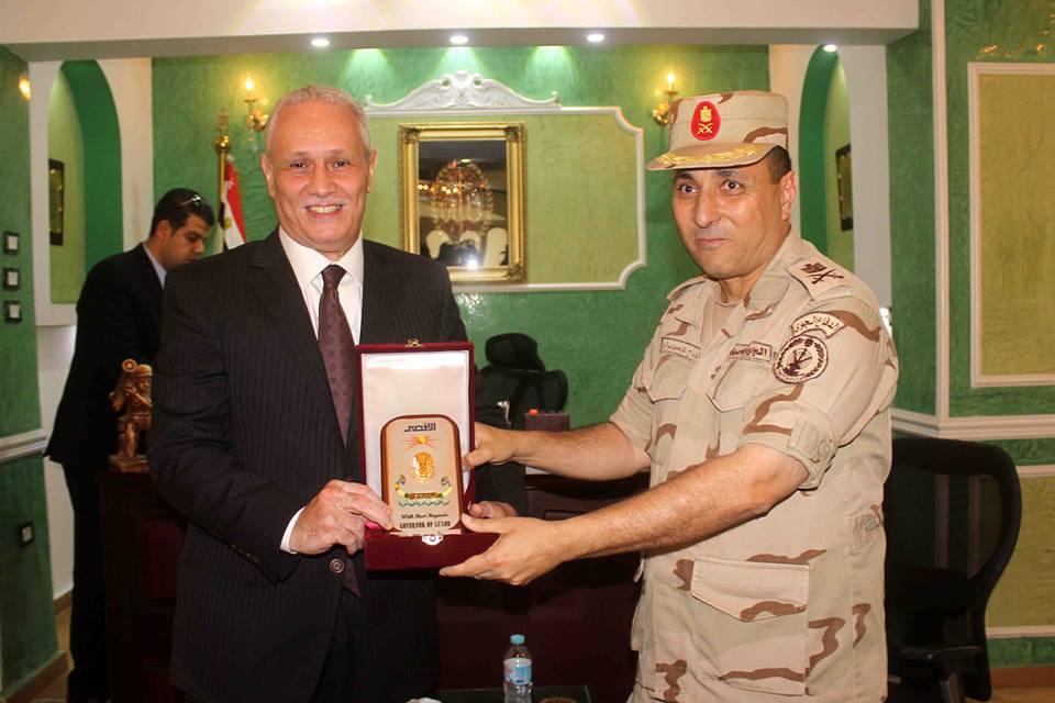 وقام المحافظ بتقديم التهنئة لكلا من اللواء اركان حرب علاء عبد الرحمن قائد الفرقة 15 دفاع جوي واللواء طيار اركان حرب ابراهيم عبد العاطي قائد المنطقة الجوية الجنوبية كما اهدي لهما درع المحافظة.