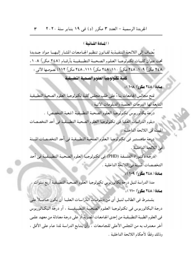 ونصت المادة الثانية على إضافة مواد جديدة للائحة التنفيذية لقانون المجلس الأعلى للجامعات، تحت عنوان كليات تكنولوجيا العلوم الصحية التطبيقية، بأرقام 248 مكرر 108 و 109 و110 و111 و 112.