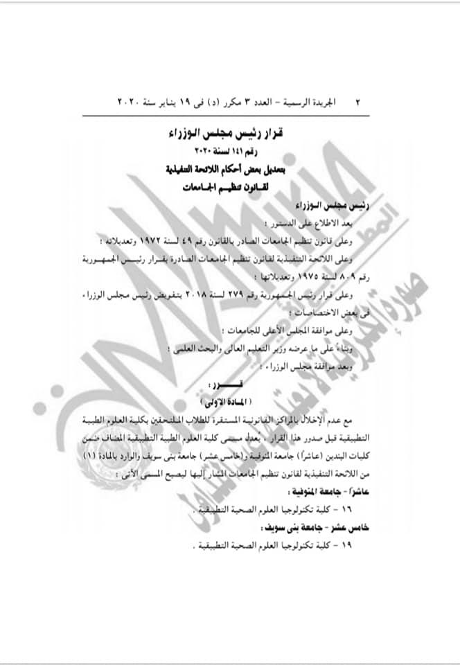 ونشرت الجريدة الرسمية في 19 يناير 2020، في العدد 3 مكرر "د"، قرار رئيس مجلس الوزراء رقم 141 لسنة 2020، بتعديل بعض أحكام اللائحة التنفيذية لقانون المجلس الأعلى للجامعات رقم 809 لسنة 1975، وذلك بعد الاطلاع على قانون المجلس الأعلى للجامعات رقم 49 لسنة 1972 وتعديلاته، وذلك بعد موافقة المجلس الأعلى للجامعات، ووزير التعليم العالي والبحث العلمي، وموافقة مجلس الوزراء.
