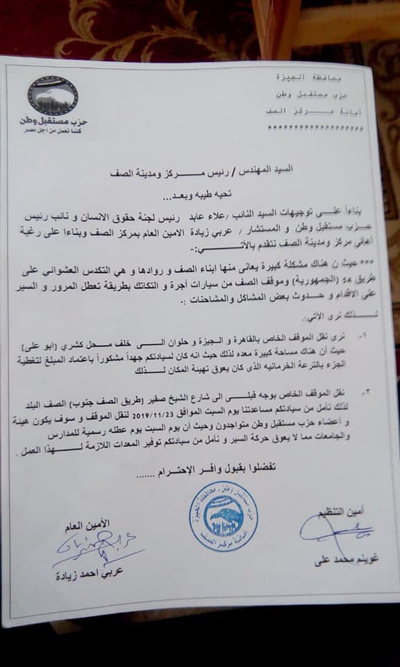 وقد تقدم طلب لنقل الموقف الخاص بالقاهرة والجيزة وحلوان إلى خلف محل كشري " أبو علي " حيث أن هناك مساحة شاغرة لعمل بها موقف خاص بذلك السيارات ، وأن يتم نقل الموقف الخاص بالوجة القبلي إلى شارع الشيخ صقير ، طريق الصف جنوب ، صف البلد ، وتم الموافقة على هذه المقترحات ويتم التنفيذ بحضور هيئة مكتب الحزب وقيادات مجلس المدينة والجهات المختصة المنوط بها التنفيذ يوم السبت الموافق 2019/11/30 .