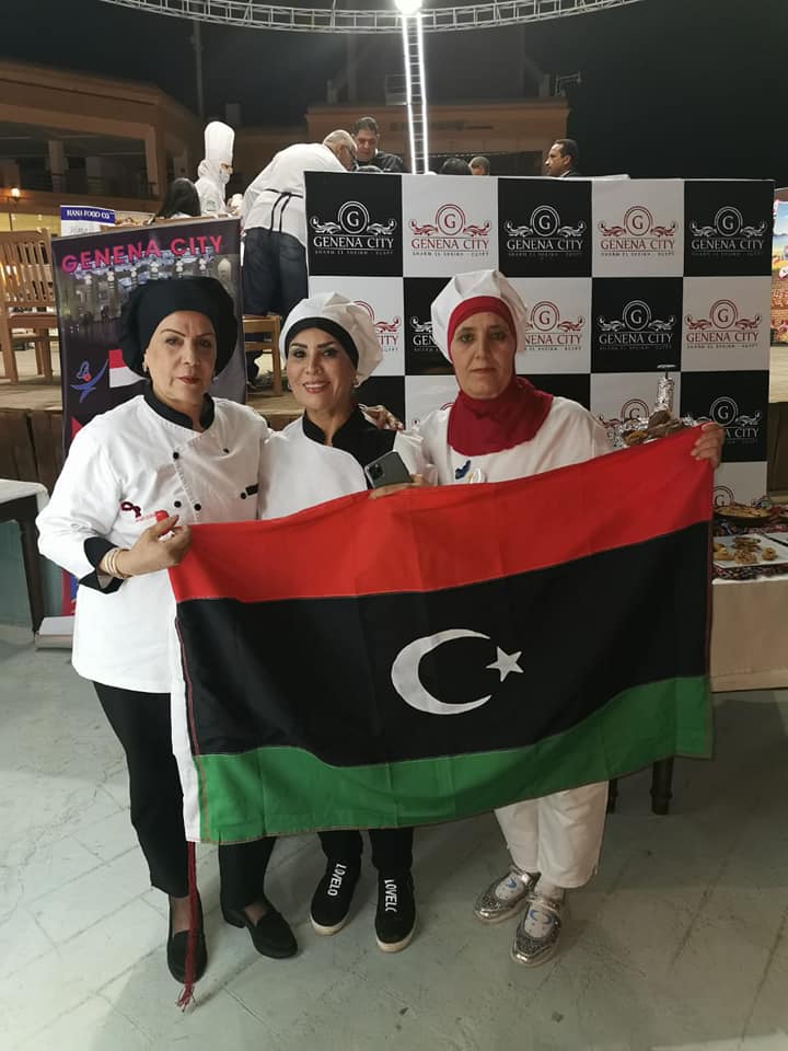 الشيف امال الزرقاني والشيف خديجة محمد والشيف فوزية ميلاد المعرفي من الفريق الليبي الفائز بالمركز الثاني فى المهرجان الدولى الافريقى العربى للطهاة بجنينة سيتى بمدينة شرم الشيخ برئاسة المستشار سمير هدية رئيس المهرجان والشيف وجدى وليم المنسق العام للمهرجان وبمساعدة الدكتورة نيفين صموائيل ولجنة التنظيم المكونة من كل من :