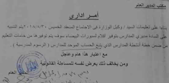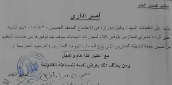 أمر إداري الى السادة مديري المدارس كل في مدرسته لتوفير أقلام السبورة للمعلمين من ضمن خطة انشطة المدارس الذي يتبع الحساب الموحد للمدارس "الرسوم المدرسية" ومن يخالف ذلك يعرض نفسه للمسائلة القانونية.