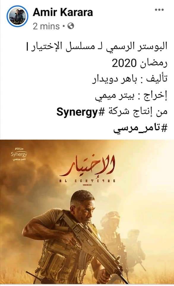 قام النجم الفنان أمير كرارة بنشر البوستر الدعائي لمسلسل "الإختيار" الذي يشارك به في دراما رمضان ٢٠٢٠ بعد ثلاثية "كلبش" التي شارك بها في ماراثون رمضان خلال الأعوام الثلاثة السابقة . مسلسل "الإختيار" مأخوذ عن قصة حقيقية للبطل الشهيد العقيد أركان حرب ( أحمد المنسي) قائد الكتيبة ١٠٣ صاعقة ، الذي أستشهد ومعه عدد من أفراد الكتيبة في كمين "مربع البرث"، بمدينة رفح المصرية في 7 يوليو عام 2017، أثناء التصدي لهجوم إرهابي على أفراد القوات المسلحة في سيناء، مقدمين أرواحهم فداءاً للوطن. " الأختيار" هو التعاون الثلاثي كرارة، ميمي، و دويدار بعد "كلبش"، و التعاون السادس لميمي و كرارة، فقد تعاونا في السينما في عملين هما "حرب كرموز" و "كازابلانكا" اللذان حققا إيرادات غير مسبوقة في تاريخ السينما. "الإختيار" بطولة أمير كرارة، أحمد العوضي، كريم محمود عبدالعزيز، و غيرهم، تأليف باهر دويدار، إخراج د/بيتر ميمي، و من إنتاج شركة سينرجي للمنتج الكبير تامر مرسي.