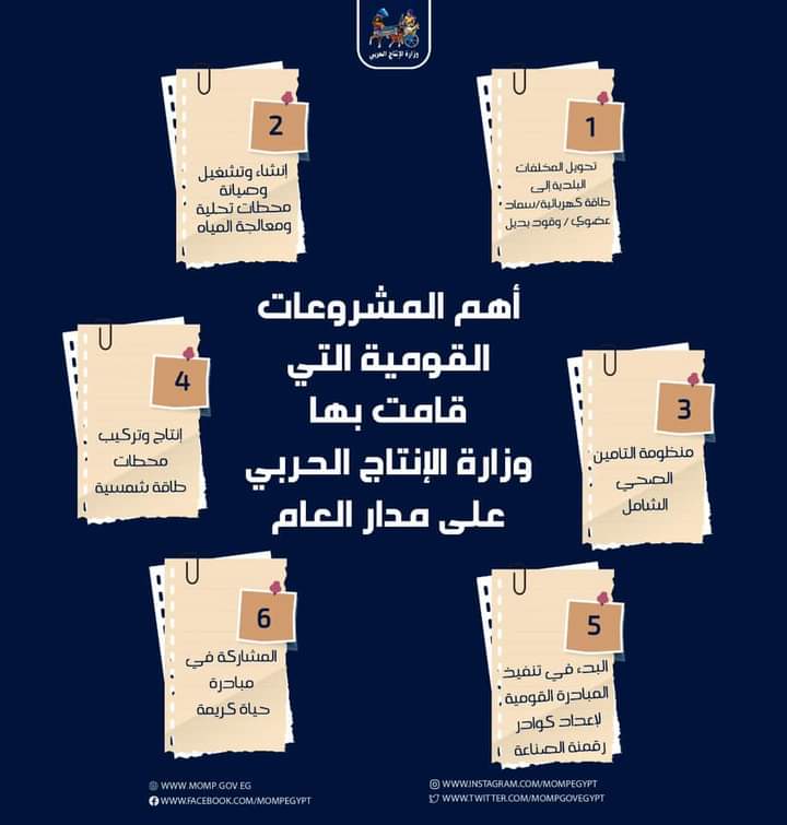 أنفوجراف حول اهم المشروعات القومية التي قامت بها وزارة الإنتاج الحربى خلال عام ( ٢٠٢٠ - ٢٠٢١)