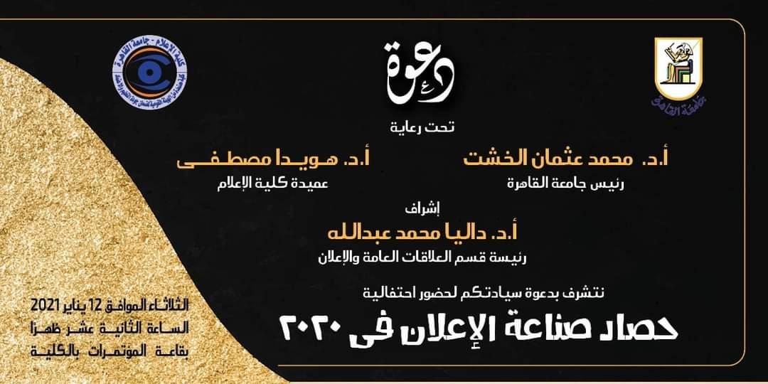 تحت رعاية أ.د. محمد عثمان الخشت رئيس جامعة القاهرة وأ.د. هويدا مصطفى عميدة الكلية، وتحت إشراف أ.د. داليا محمد عبد الله رئيسة قسم العلاقات العامة والإعلان، تعقد كلية الإعلام ويبينار يوم الثلاثاء القادم الموافق 12 يناير 2021 وفى تمام الثانية عشر ظهرا وذلك لمناقشة نتائج دراسة علمية عن حصاد صناعة الإعلان فى مصر فى 2020. حيث أجرى قسم العلاقات العامة والإعلان هذه الدراسة باستخدام استبيان عن طريق المقابلة الشخصية على عينة بلغ عددها 1797 مفردة من الذكور والإناث فى مختلف محافظات مصر ومن فئات عمرية مختلفة، واشترك طلاب المستوى الرابع فى جمع البيانات تحت إشراف رئيسة القسم و 31 من أعضاء هيئة التدريس والهيئة المعاونة.