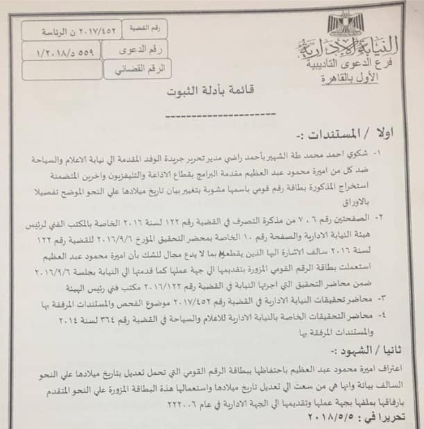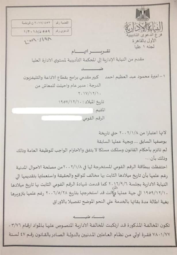 وافق المستشار محمد إسماعيل نافع، نائب رئيس هيئة النيابة الإدارية في القضية رقم 198 لسنة 60 قضائية عليا على إحالة المذيعة أميرة عبد العظيم، كبير مقدمي برامج في ماسبيرو للمحاكمة لاحتفاظها ببطاقة رقم قومي رغم علمها بتزويرها بقصد إطالة مدة بقائها في الخدمة لمدة عامين.