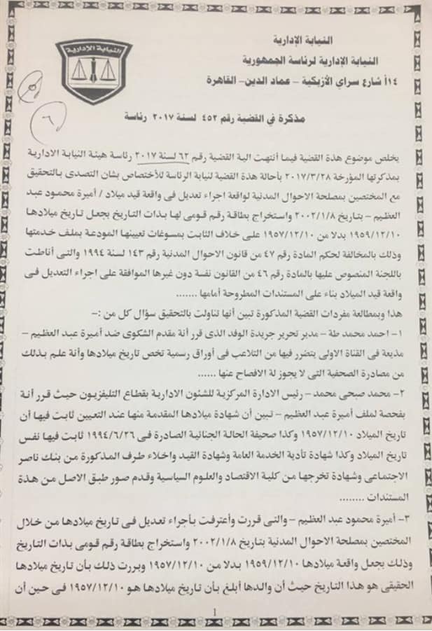 وتلقت النيابة الإدارية مذكرة من مساعد وزير الداخلية لقطاع مصلحة الأحوال المدنية ثابت به أن المتهمة تقدمت للمصلحة بتاريخ 8 يناير 2002 لإجراء تعديل في تاريخ ميلادها وتم إجراء التعديل واستخراج بطاقة رقم قومي لها بذات التاريخ وذلك بجعل تاريخ ميلادها 10 ديسمبر 1959 بدلًا من 10 ديسمبر 1957 استنادا إلى البطاقة الشخصية التي تقدمت به آنذاك مشيرًا إلى أن المستندات التي يتقدم بها ذوي الشأن بشأن واقعات الميلاد أو الوفاة يحتفظ بها لمدة 5 سنوات فقط من تاريخ إجراء التعديل الذي يتم بموجب أصل شهادة الميلاد الورقية