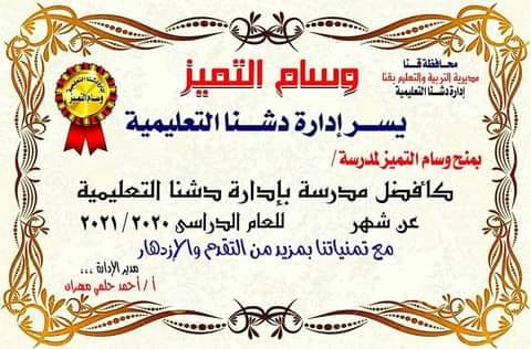 تحت رعاية السيد اللواء محافظ قنا والسيد الدكتور وكيل وزارة التربية والتعليم اطلقت ادارة دشنا التعليمية مبادرة (وسام التميز) وذلك تقديرا من الادارة التعليمية وتشجيعا على الجهد المبذول وحثهم ودعمهم على مواصلة هذا الجهد والتميز لرفع كفاءة العملية التعليمية بمدارس الادارة من خلال لجنة برئاسة السيد| وكيل الادارة وعضوية رؤساء اقسام مراحل التعليم واعضاء المتابعة وتقويم الاداء لاختيار ( 4 ) مدارس كل شهر ومنحهم وسام التميز وتقوم لجنة من قبل الادارة بتسليم وسام التميز للمدارس الفائزة بطابور الصباح تقديرا وشكرا من الادارة التعليمية لجميع العاملين بالمدرسة وسيتم نشر اسماء المدارس الفائزة فى نفس يوم التسليم ......والله الموفق والمستعان
