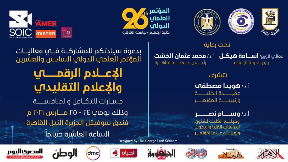 تعقد كلية الإعلام بجامعة القاهرة مؤتمرها العلمي الدولي السادس والعشرين يومي 24 و25 مارس الجاري، تحت عنوان "الإعلام الرقمي والإعلام التقليدي: مسارات للتكامل والمنافسة". يناقش المؤتمر عددا من القضايا المركزية والموضوعات المحورية في مستقبل صناعة الإعلام، وذلك من خلال العديد من الأبحاث والدراسات العلمية والحلقات النقاشية التي تبحث في تقنيات الإعلام الرقمي والتأثيرات المتبادلة بينها وبين وسائط الإعلام التقليدي على شكل ومحتوى الرسالة الإعلامية، تمهيدا للوصول إلى توصيات أكاديمية ومهنية تثري الساحة الإعلامية.