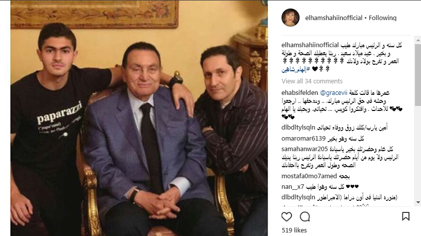 ونشرت إلهام شاهين، أحدث صورة لحسنى مبارك جمعته بنجله علاء وحفيده عبر حسابها على موقع تبادل الصور"انستجرام"، وكتبت عليها قائلة: " كل سنة والرئيس مبارك طيب وبخير عيد ميلاد سعيد ربنا يعطيك الصحة و طولة العمر و تفرح بولاد ولادك".