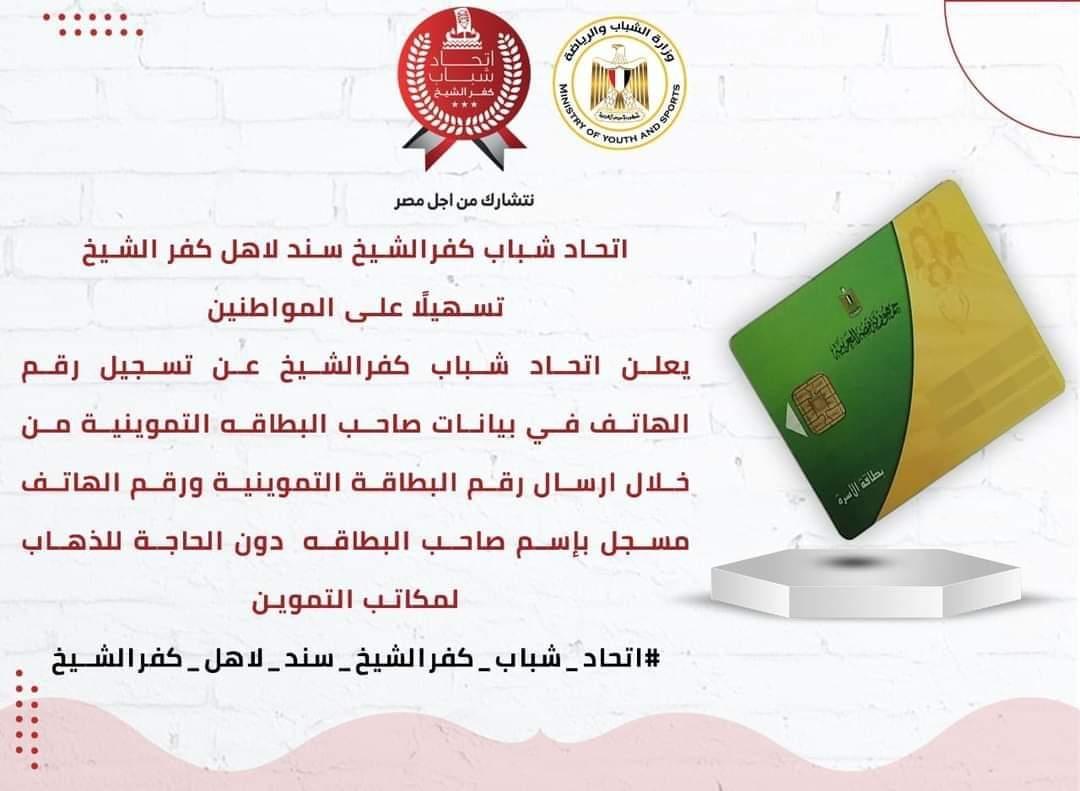 انطلاقاً من مبادرة اتحاد شباب كفرالشيخ سند لاهل كفر الشيخ، أعلن اتحاد شباب كفرالشيخ عن تسجيل رقم الهاتف في بيانات صاحب البطاقه التموينية من خلال ارسال رقم البطاقة التموينية ورقم الهاتف مسجل بإسم صاحب البطاقه دون الحاجة للذهاب لمكاتب التموين.