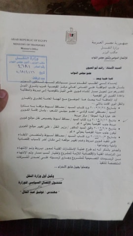 وورد إلينا مستندات تفيد إنه تم إصدار خطاب برقم 4681 فى 16/4/2018 من مكتب وزير النقل للاتصال السياسى وشئون مجلس النواب للسيد راشد ابو العيون عضو مجلس النواب عن دائرة القوصية والذى يشرح فيه انه ايماء الى الطلب المقدم للوزير بالتماس أهالى القوصية غرب وشرق النيل لتضررهم من تحويل مسار انشاء كوبرى على النيل بالقوصية الى ديروط والمطالبة بإعادة الكوبرى الى القوصية مرة أخرى ، وكان الرد انه بالبحث عن هذا الموضوع مع الهيئة العامة للطرق والكبارى والنقل البرى أفادت إنه بتاريخ 28/7/2003 ورد كتاب محافظ اسيوط مرفقا به مذكرة مصطفى قرشى عضو مجلس النواب بشأن إقامة الكوبرى عند عبارة قرية الحوطا مركز ديروط وبتاريخ 16/8/2012 ورد كتاب محافظ اسيوط بخصوص نقل موقع كوبرى ديروط جنوب القوصية بحوالى 5 كيلو ، وبتاريخ 3/10/2012 ورد كتاب المحافظ والمتضمن الابقاء على تنفيذ كوبرى ديروط وعدم تغيير موقعه الى مكان أخر لأسباب اقتصادية وأمنية واجتماعية ، وختم الجواب بانه قد تم طرح عملية الاستشارات الفنية وتم الانتهاء من الدراسات الفنية والاقتصادية اللازمة للمشروع واختيار أنسب مسار وتم الانتهاء من الرسومات التصميمية للمشروع وترسيته على احدى الشركات المتخصصة للتنفيذ .