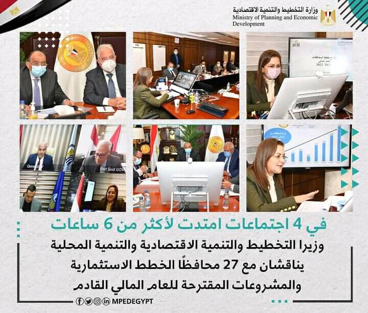 عقدت الدكتورة هالة السعيد، وزيرة التخطيط والتنمية الاقتصادية، واللواء محمود شعراوى، وزير التنمية المحلية، 4 اجتماعات عبر الفيديو كونفرانس مع السادة المحافظين والتي استمرت لأكثر من 6 ساعات بحضور عدد من قيادات الوزارتين، وذلك لمناقشة مقترحات الخطط الاستثمارية والمشروعات المقترحة من خلال الوزارات والجهات المركزية للعام المالى القادم 2021- 2022، كما تم استعراض الموقف التنفيذي للخطط الاستثمارية في المحافظات للعام المالى 2020 -2021.