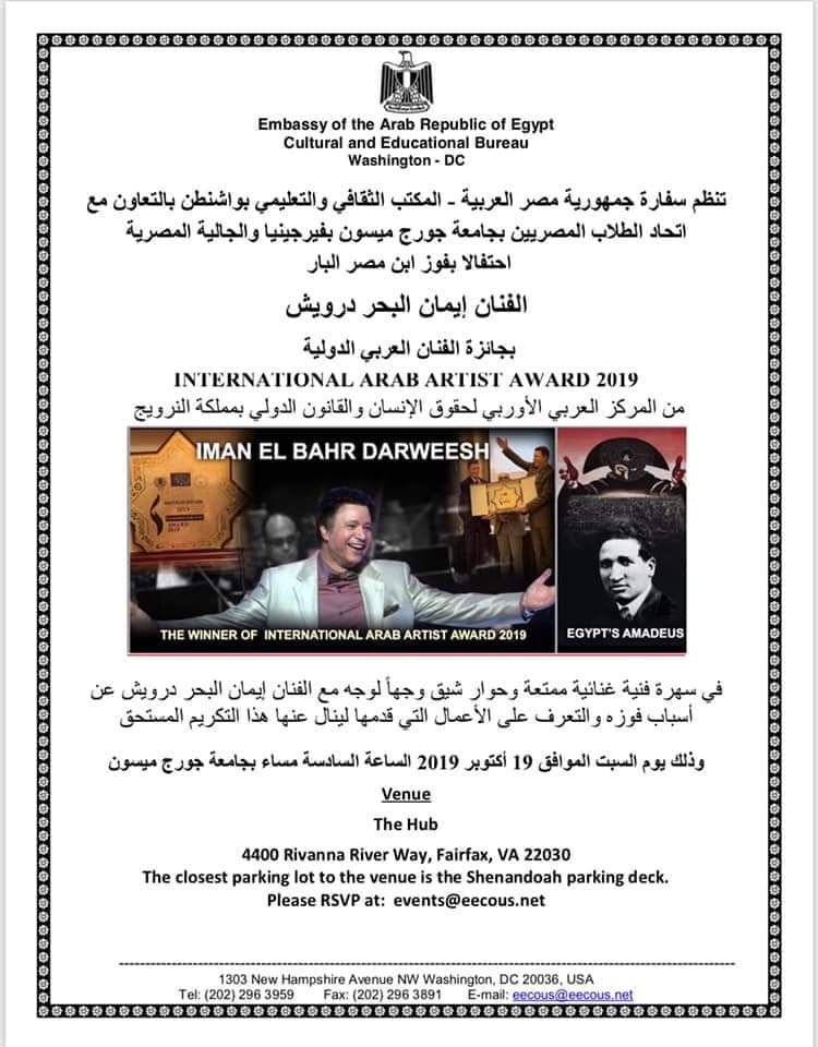 تحتفل سفارة جمهورية مصر العربية المكتب الثقافي بالتعاون مع إتحاد الطلاب المصريين بجامعة جورج ميسون بفيرجينيا والجالية المصريةبأميركا بالفنان ايمان البحر درويش بجائزة فنان العرب الدولية لعام ٢٠١٩ في سهره فنيه غنائية ممتعه وحوار شيق وجها لوجه مع الفنان إيمان البحر درويش عن اسباب فوزه والتعرف على الأعمال التي قدمها لينال عنها ذلك التكريم المستحق وذلك يوم السبت الموافق 19 اكتوبر 2019 الساعه السادسه مساء بجامعه جورج ميسون