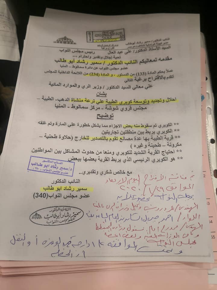 وافقت لجنة الإقتراحات والشكاوي ، بمجلس@ النواب ، منذ قليل ، علي الاقتراح برغبة المقدم من النائب الدكتور سمير رشاد أبو طالب عضو مجلس النواب عن دائرة مركز سمالوط ، شمال المنيا ، بشأن احلال وتجديد كوبري وتوسعه كوبري الطيبة على ترعه منشأه الدهب بقرية الطيبة بمجلس قروي شوشة - مركز سمالوط - المنيا .