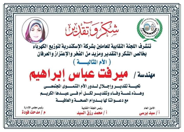 تم اليوم تكريم المهندسة ميرفت عباس بالتنفيذ الذاتي اما مثالية للعاملين بشركة الإسكندرية لتوزيع الكهرباء وقام ااسيدالمهندس مدحت فودة رئيس مجلس الإدارة والسيد المهندس ايهاب الفقى / رئيس قطاعات التشغيل والسيد المهندس اشرف عثمان /رئيس قطاع الخطوط والكابلات بتكريمها ومنحها شهادة تقدير .