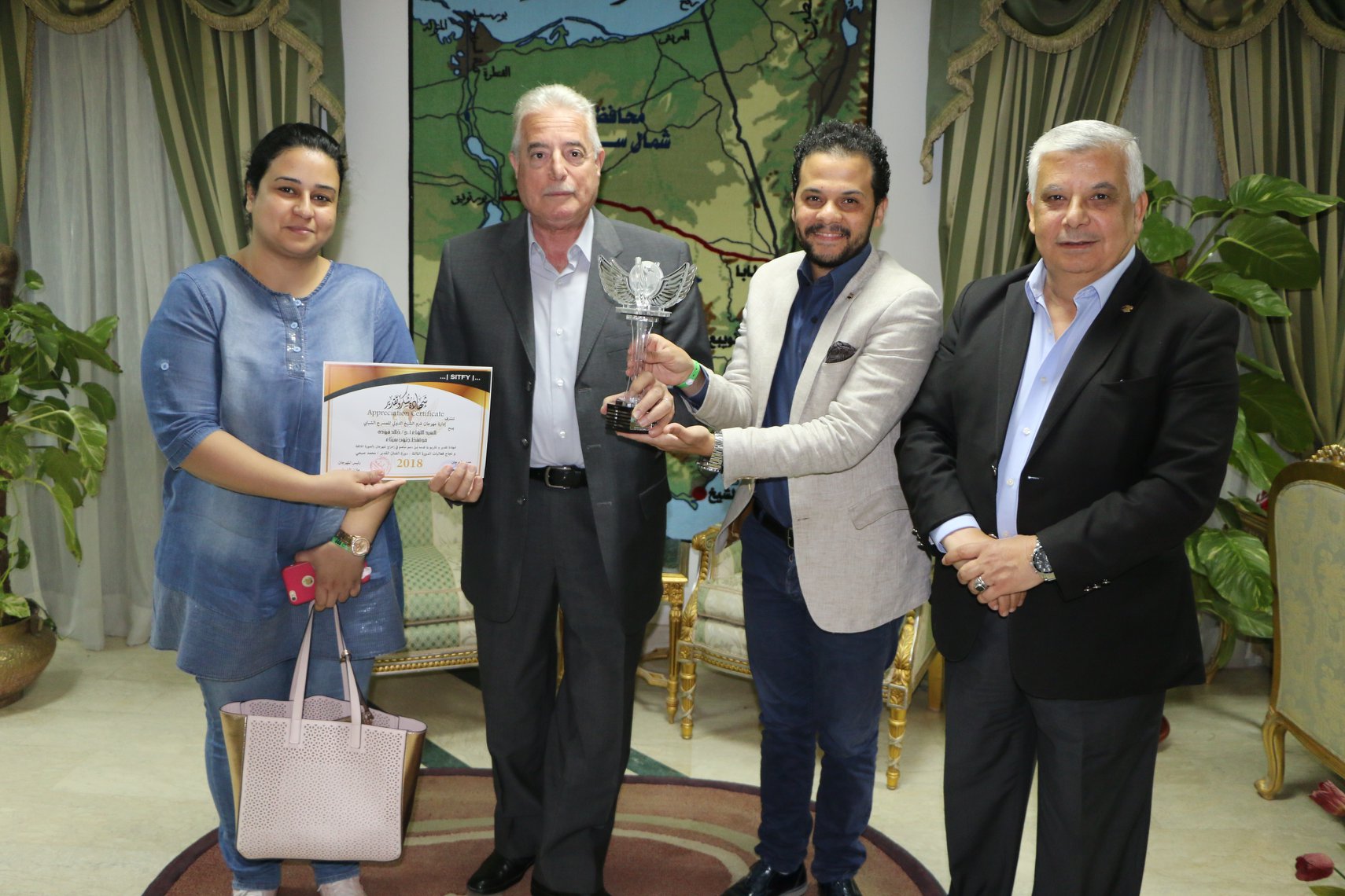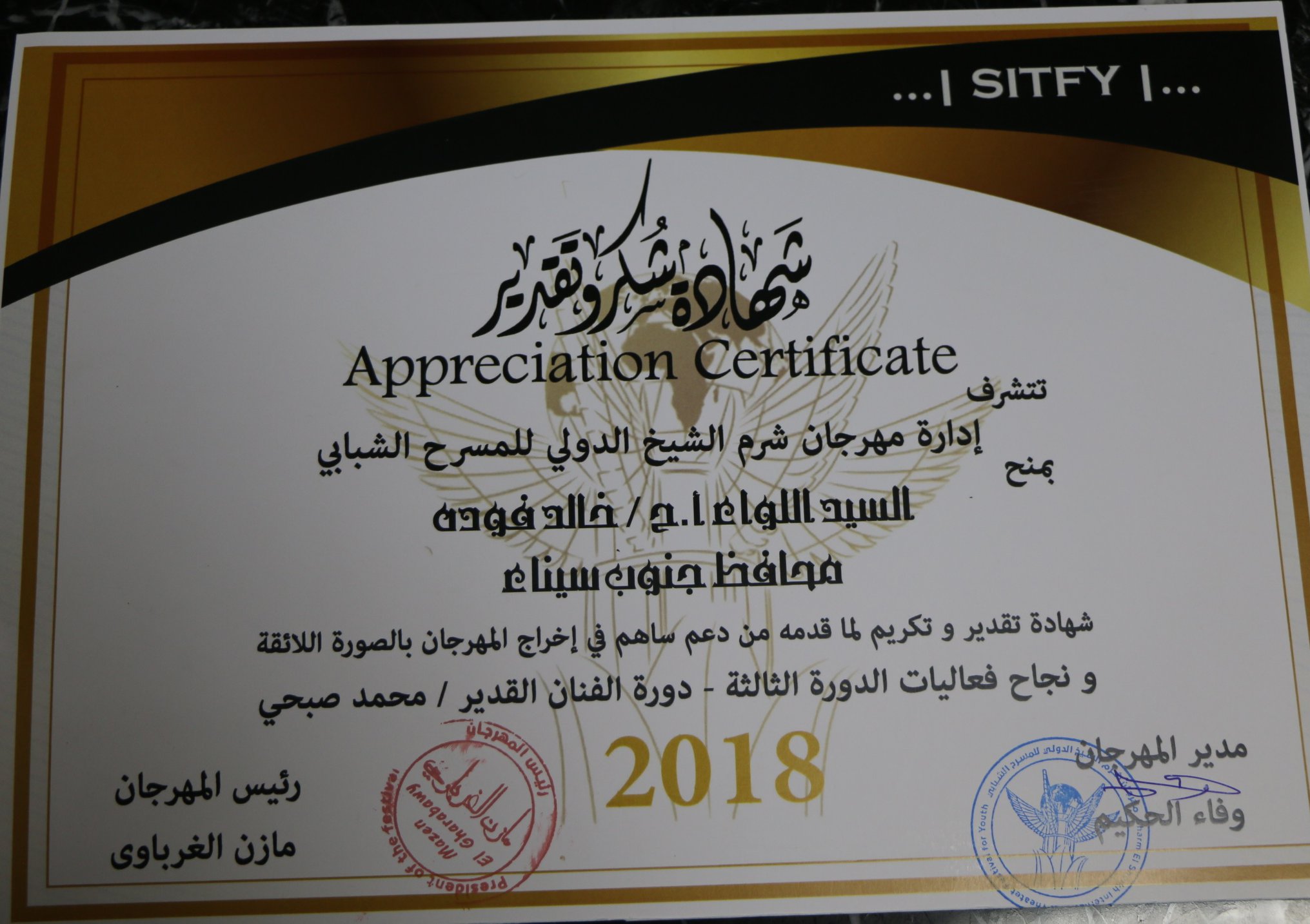 " تتشرف إدارة مهرجان شرم الشيخ الدولي للمسرح الشبابي ..بمنح السيد اللواء أ.ح / خالد فودة، محافظ جنوب سيناء شهادة تقديروتكريم لما قدمه من دعم ساهم في إخراج المهرجان بالصورة اللائقه ونجاح فعاليات الدورة الثالثه – دورة الفنان القديرمحمد صبحي مدير المهرجان وفاء الحكيم، رئيس المهرجان مازن الغرباوي.