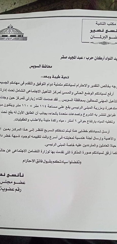 جاء، ذلك بعد زيارة النائبة نانسى نصير عضو مجلس النواب الى مركز التأهيل الاجتماعي