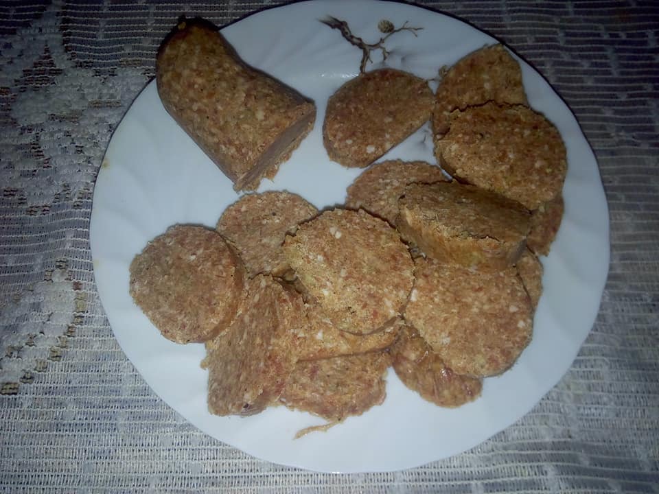 اخليطي كل المكونات مع بعض كويس جدا حتي تتجانس مع بعض وتلفيه رول علي شكا اسطواني زي الانشون ونضع في الفريزر ولما يجمد يقطع وهو مجمد بسكينه مشرشره