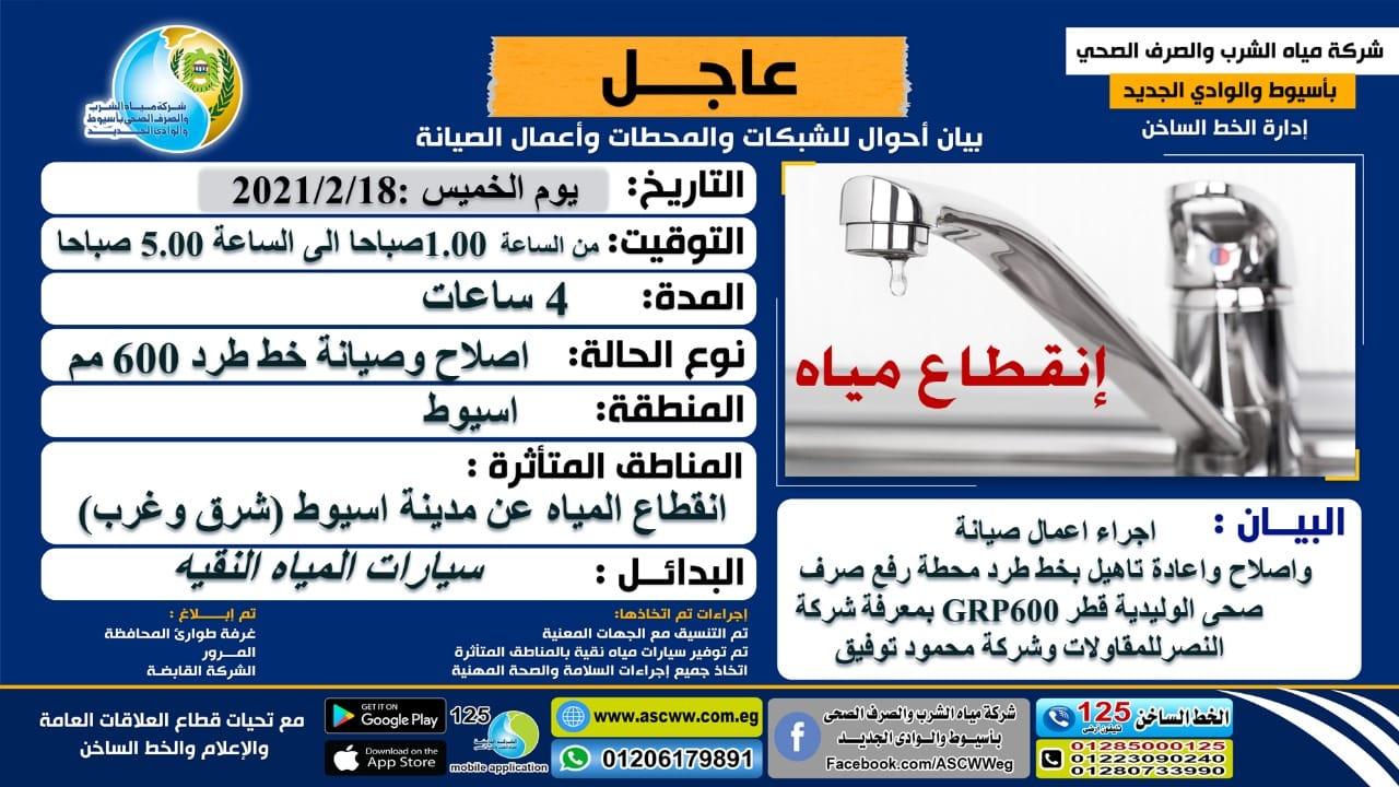وبناءً على ذلك تنوه الشركة أنه سيتم قطع المياه عن مدينة أسيوط بالكامل (شرق – غرب) ولمدة 4 ساعات بدءً من الساعة الواحدة صباحاً صباح يوم الخميس الموافق 18 فبراير 2021 م حتى الساعة الخامسة فجراً من نفس اليوم .