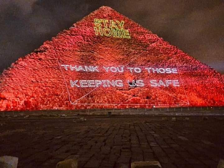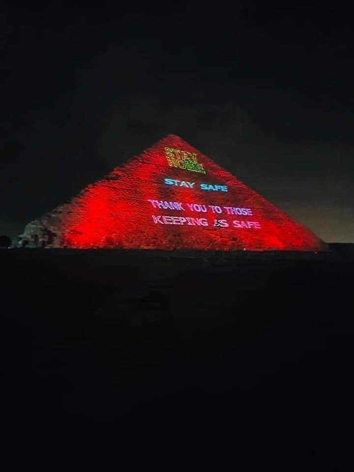 فى سابقة لم تحدث من قبل تزينت اليوم الاهرامات المصرية بعلم مصر يتخللها عبارات شكر وتقدير للطاقم الطبى بالكامل فى وقوفه بجانب الشعب المصرى العظيم فى مجابهة فيرس كورونا الذى سبب الذعر للعالم اجمع