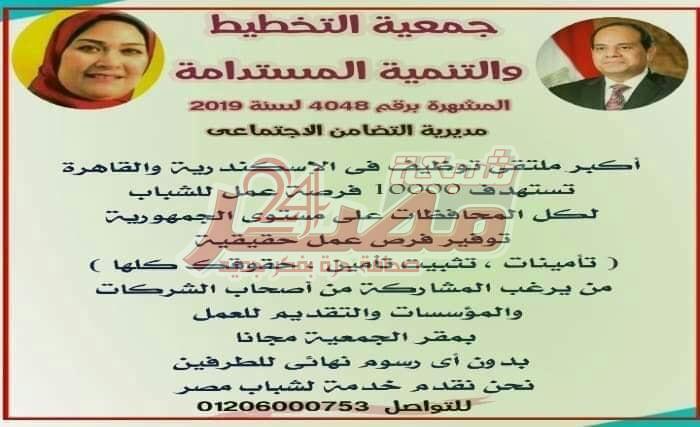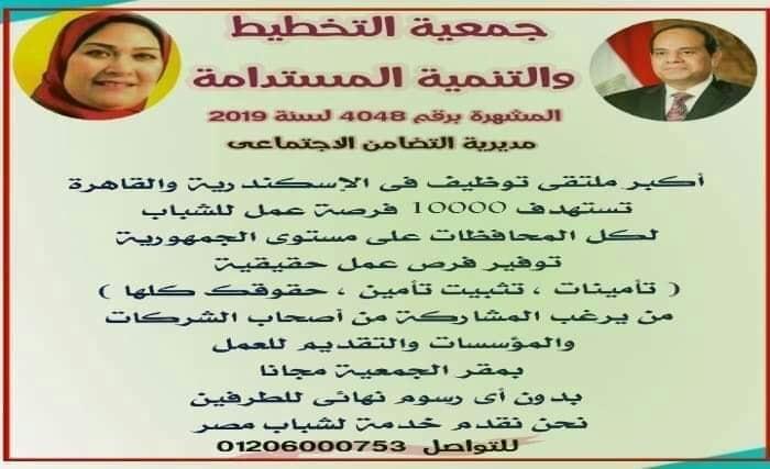 أعلنت اليوم جمعية التخطيط والتنمية المستدامة عن توافر عشرة الف وظيفة بكافة محافظات الجمهورية