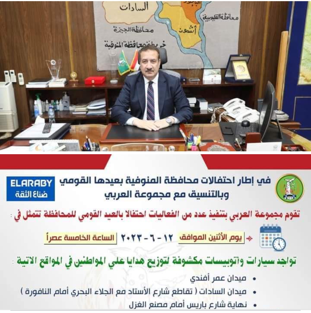 في إطار احتفالات محافظة المنوفية بعيدها القومي الـ 117، والتنسيق الدائم والمستمر بين محافظة المنوفية ومجموعة العربي ،أشار اللواء إبراهيم أبو ليمون محافظ المنوفية إلى قيام مجموعة العربي غدا الاثنين الموافق 12 يونيو بتنظيم عدد من الأنشطة الترفيهية والموسيقية من خلال سيارات وأتوبيسات مكشوفة لتوزيع هدايا علي المواطنين وتهنئتهم بالعيد القومى للمحافظة وذلك بميدان عمر أفندي وميدان السادات ( تقاطع شارع الأستاد مع الجلاء البحري أمام النافورة )ونهاية شارع باريس أمام مصنع الغزل في تمام الساعة الخامسة عصرا ، يأتى ذلك حرصا من مجموعة العربي على مشاركة أهل المنوفية احتفالهم بالعيد القومى وإدخال الفرحة على قلوبهم.