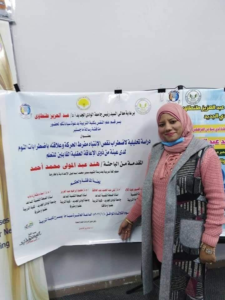ناقشت الباحثة هند عبد المولي محمد أحمد - معلم لغة عربية بمدرسة الشهيد سمير محمد اسماعيل الاعدادية المشتركة بمدينة الخارجة رسالة الماجستير بعنوان " دراسة تحليلية لاضطراب نقص الإنتباه مفرط الحركة وعلاقته باضطرابات النوم لدي عينة من ذوي الإعاقة العقلية القابلين للتعلم " اليوم الاثنين الموافق 4 يناير 2021 وذلك علي مسرح كلية التربية بجامعة الوادي الجديد وتحت رعاية السيد الدكتورعبد العزيز طنطاوي رئيس جامعة الوادي الجديد