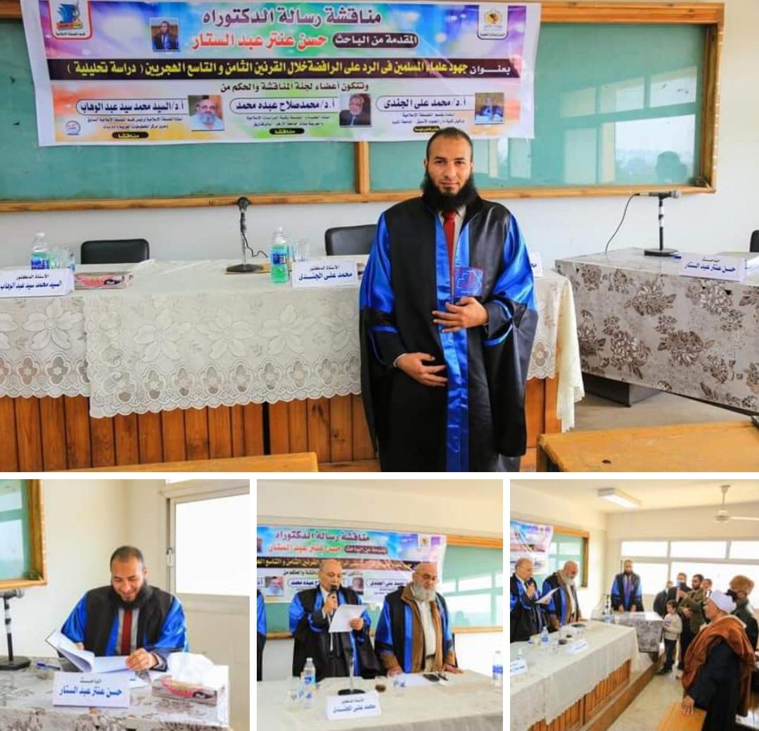 حصل الباحث حسن عنتر عبدالستار ابن محافظةقنا مركز ابوتشت قريةالكرنك عائلة البواقير على درجة الدكتوراه فى الفلسفة الاسلامية كلية دار العلوم المنيا بتقدير مرتبة الشرف الأولى فى موضوع جهود علماء المسلمين فى الرد على الرافضة خلال القرنين الثامن والتاسع الهجريين دارسة تحليلة