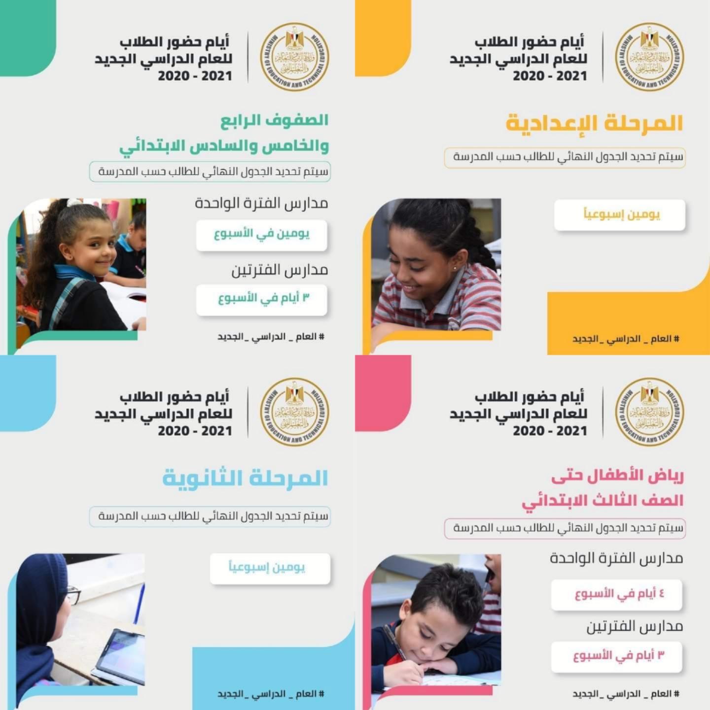 - الصفوف من الأول إلى الثالث الإعدادي.. سيكون الحضور يومين أسبوعيًا، و سيتم تحديد الجدول النهائي لحضور الطالب على مستوى المدرسة.