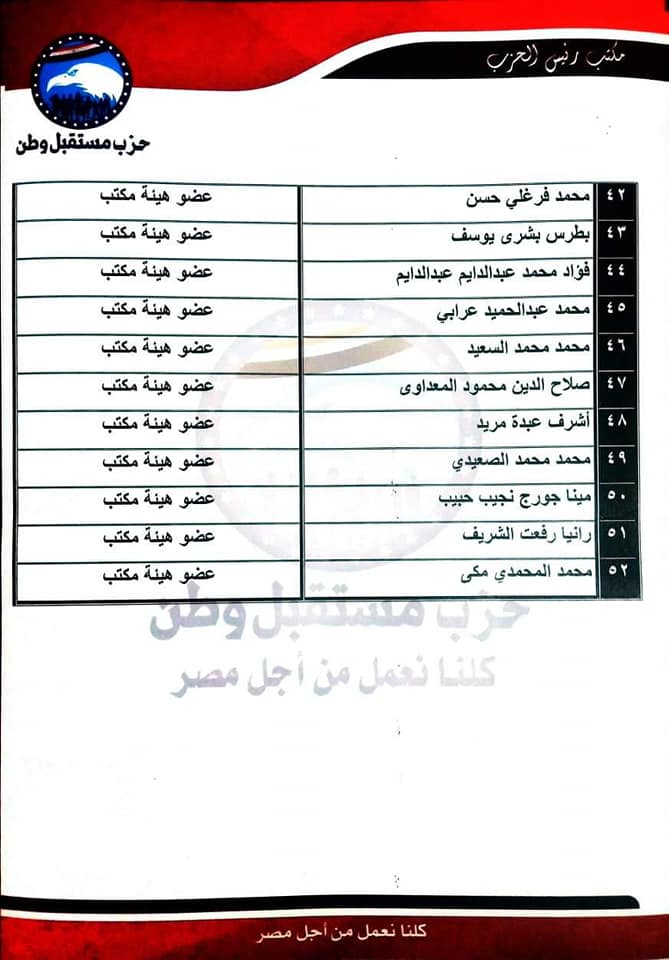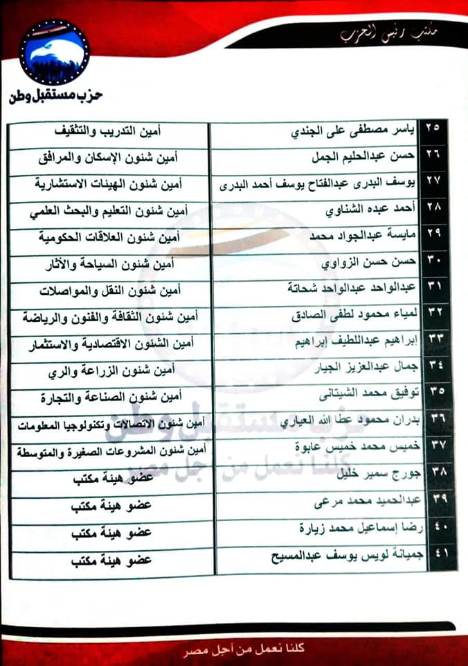 وجاءت باقى التشكيلات كالاتى حنان مسعد ابوالفتوح قنديل أمينة للمرأة ومحمد حسن عبيدى امين شئون المجالس المحلية وسعد عبدالحميد محمدعمارة امين المهنيين ومصطفى فتحى الحمادى امين شئون الطاقة والبيئة وأمل محمود على جلو امين شئون القبائل العربية وشريف محمد محمود طولان امين العضوية وعمرو عبدالعزيز محمد امين الإعلام ووائل محمد سرحان امين الشباب وحسام الدين عزت امين المتابعة والتواصل الاجتماعى وياسر السعيد احمد شحاتة أمين العمل الجماهيرى وصفاء محمد سيداحمد العبد امين العلاقات العامة وسيد احمد محمد سيداحمد امين الشئون البرلمانية ومجدى مصطفى محمود شراكى امين العمال والفلاحين ومحمد الدمرداش ابو الفتوح امين ذوى الاعاقة وعزالدين جودة امين قطاع الأعمال ووليد محمد زيتون امين تنمية الموارد والخدمة الاجتماعية وصلاح محمود مقلد امين الشئون القانونية وياسرمصطفى على الجندى امين التدريب والتثقيف وحسن عبدالحليم الجمل امين شئون الإسكان والمرافق ويوسف البدرى عبدالفتاح يوسف احمدالبدرى امين شئون الهيئات الاستشارية وأحمد عبده الشناوى امين شئون التعليم والبحث العلمي ومايسة عبدالجواد محمد امين شئون العلاقات الحكومية وحسن حسن الزواوى امين شئون السياحة والآثار وعبدالواحد عبدالواحد شحاتة أمين شئون النقل والمواصلات ولمياء محمود لطفى الصادق امين شئون الثقافة والفنون والرياضة وإبراهيم عبداللطيف ابراهيم امين الشئون الاقتصادية والاستثمار وجمال عبدالعزيز الجيار امين شئون الزراعة والري وتوفيق محمدالشيتانى امين شئون الصناعة والتجارة وبدران محمود عطاالله العيارى امين شئون الاتصالات وتكنولوجيا المعلومات وخميس محمد خميس عابوه امين شئون المشروعات الصغيرة والمتوسطة وجورج سمير خليل عضوهيئة مكتب وعبدالحميد محمد مرعى عضو هيئة مكتب ورضا اسماعيل محمد زيارة عضو هيئة مكتب وجميانة لويس يوسف عبد المسيح عضو هيئة مكتب ومحمد فرغلى حسن عضو هيئة مكتب وبطرس بشرى يوسف عضو هيئة مكتب وفؤاد محمد عبد الدايم عبدالدايم عضو هيئة مكتب ومحمدعبد الحميد عرابى عضو هيئة مكتب ومحمد محمد السعيد عضو هيئة مكتب وصلاح الدين محمود المعداوى عضو هيئة مكتب وأشرف عبده مريد عضو هيئة مكتب ومحمد محمد الصعيدى عضو هيئة مكتب ومينا جورج نجيب حبيب عضو هيئة مكتب ورانيا رفعت الشريف عضو هيئة مكتب ومحمد المحمدى مكى عضو هيئة مكتب .