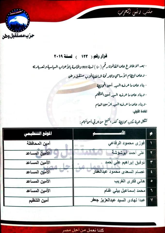 اعتمد المهندس اشرف رشاد الشريف رئيس حزب مستقبل وطن التشكيل الجديد لهيئة مكتب الحزب بالمحافظة وجاء التشكيل كالأتى :