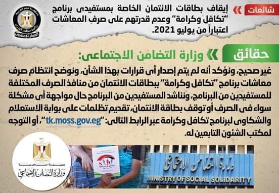 انتشر في بعض المواقع الإلكترونية وصفحات التواصل الاجتماعي أنباء بشأن إيقاف بطاقات الائتمان الخاصة بمستفيدي برنامج "تكافل وكرامة" وعدم قدرتهم على صرف المعاشات اعتباراً من يوليو 2021، وقد قام المركز الإعلامي لمجلس الوزراء بالتواصل مع وزارة التضامن الاجتماعي، والتي نفت تلك الأنباء، مُؤكدةً أنه لا صحة لإيقاف بطاقات الائتمان الخاصة بمستفيدي برنامج "تكافل وكرامة" وعدم قدرتهم على صرف المعاشات اعتباراً من يوليو 2021، وأنه لم يتم إصدار أي قرارات بهذا الشأن، مُوضحةً انتظام صرف معاشات برنامج "تكافل وكرامة" ببطاقات الائتمان من منافذ الصرف المختلفة للمستفيدين من البرنامج، مُناشدةً المستفيدين من البرنامج حال مواجهة أي مشكلة سواء في الصرف أو توقف بطاقة الائتمان، تقديم تظلمات على بوابة الاستعلام والشكاوى لبرنامج تكافل وكرامة عبر الرابط التالي: "tk.moss.gov.eg"، أو التوجه لمكتب الشئون التابعين له.