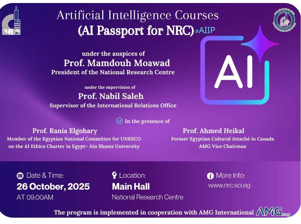 في إطار توجيهات الدكتور أيمن عاشور وزير التعليم العالي والبحث العلمي، بتعزيز التحول الرقمي في مؤسسات التعليم العالي والبحث العلمي، وبناء كوادر وطنية قادرة على توظيف التقنيات الحديثة في دعم منظومة البحث والتطوير، انطلقت فعاليات البرنامج التدريبي الدولي للذكاء الاصطناعي الذي ينظمه مكتب العلاقات الدولية بالمركز القومي للبحوث، بالتعاون مع مجموعة AMG الدولية الرائدة في مجالات التدريب والتحول الرقمي.