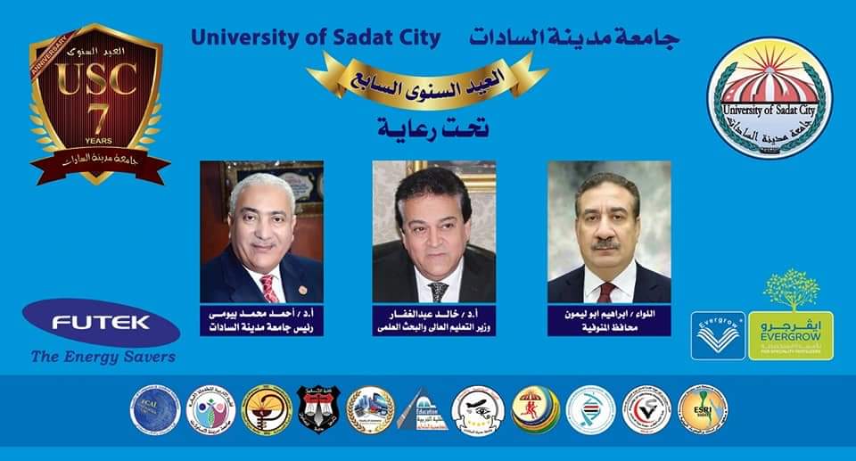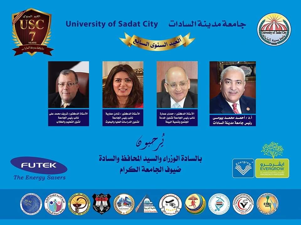 تحتفل جامعة مدينة السادات بعيد الجامعة السابع غدا وبعد غد تحت رعاية الدكتور خالد عبد الغفار وزير التعليم العالي. زاللواء إبراهيم أبو ليمون محافظ المنوفيه و الدكتور أحمد محمد بيومي رئيس الجامعة ونواب الجامعة.