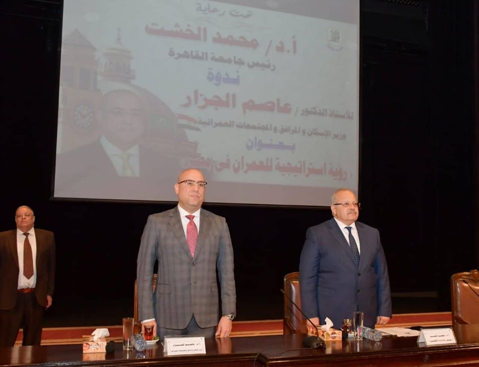 من جانبه قال الدكتور عاصم الجزار وزير الإسكان، إنه يتشرف بوجوده في جامعة القاهرة لكونه أحد خريجيها وأحد أساتذتها قبل الإنتقال للعمل بوزارة الإسكان، مؤكدًا أهمية دور جامعة القاهرة وأساتذتها في كافة المجالات.