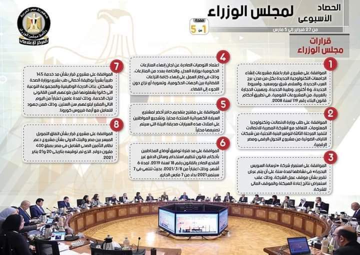 نشر المركز الإعلامي لمجلس الوزراء، تقريراً شمل إنفوجرافات سلط من خلالها الضوء على الحصاد الأسبوعي لمجلس الوزراء، وذلك خلال الفترة من 27 فبراير إلى 5 مارس 2021، والذي تضمن الموافقة على عدد من القرارات، فضلاً عن الاجتماعات واللقاءات التي عقدها الدكتور مصطفى مدبولي، رئيس مجلس الوزراء، بالإضافة إلى ما قام به سيادته من أنشطة.