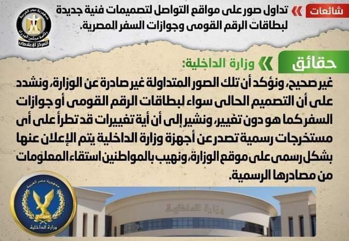 بعد تواصل المركز الإعلامي لمجلس الوزراء مع وزارة الداخلية، والتي نفت تلك الأنباء، مُؤكدةً أنه لا صحة للصور المتداولة بهذا الشأن، وأن تلك الصور المتداولة غير صادرة عن الوزارة، مُشددةً على أن التصميم الحالي سواء لبطاقات الرقم القومي أو جوازات السفر كما هو دون تغيير، مُشيرةً إلى أن أية تغييرات قد تطرأ على أي مستخرجات رسمية تصدر عن أجهزة وزارة الداخلية يتم الإعلان عنها بشكل رسمي على موقع الوزارة، مُهيبةً بالمواطنين استقاء المعلومات من مصادرها الرسمية.