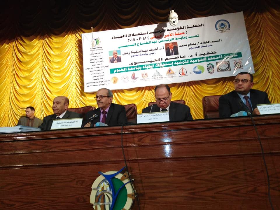 حضر ظهر اليوم اللواء :عصام سعد محافظ الفيوم الحملة القومية لترشيد استهلاك المياه حملة الامن المائي لسنة(2018/2019) وقد اقيمت الحملة بقاعة المؤتمرات الكبري بجامعة الفيوم تحت رعاية السيد الرئيس عبد الفتاح السيسي وبحضور الدكتور مسعد عويس و الأستاذ ابراهيم مغيب منسق عام الحملة بالفيوم واللواء احمد زغلول نائب رئيس الحملة